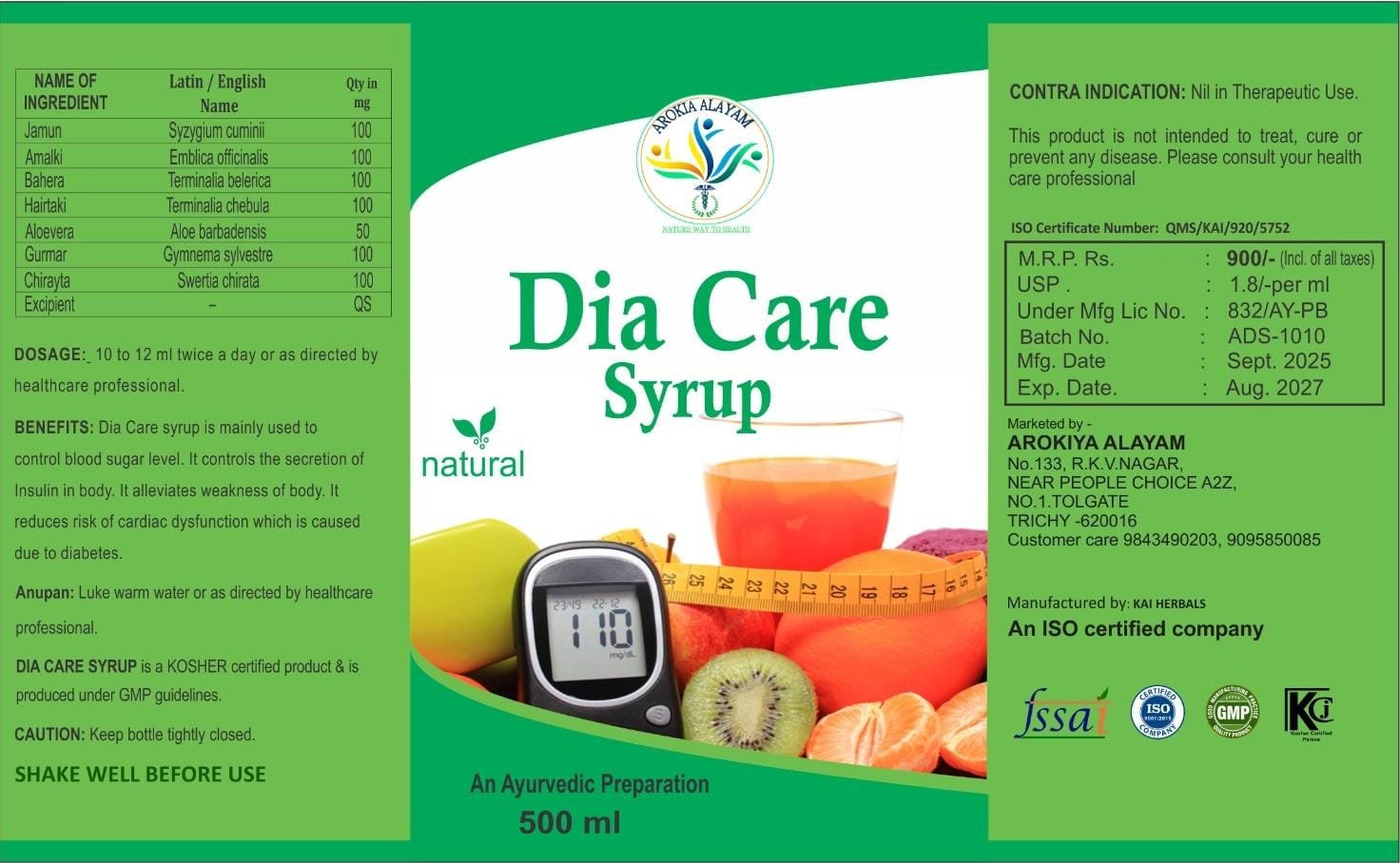 சர்க்கரை வியாதி உள்ளவர்களுக்கு பக்க விளைவுகள் இல்லாமல் சர்க்கரை அளவை கட்டுப்பாட்டில் வைக்கும். தாகம், அசதி, அதிகமான சிறுநீர் போக்கு, அதிக பசி, பாத எரிச்சல் மற்றும் சர்க்கரை வியாதியினால் வரும் அனைத்து அறிகுறிகளுக்கும் நிவாரணம் தரும் சிறந்த மூலிகை கலவை. நமது Dia care syrup சர்க்கரை நோயாளிகளுக்கு ஓர் வரப்பிரசாதமாகும்.