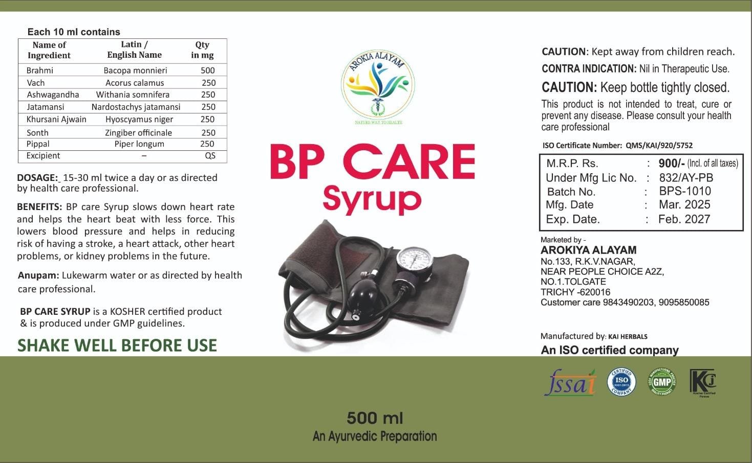 Arokiya Alayam – BP Care Syrup -500 ML